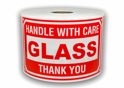 Glass Shipping Labels 2.5 in. x 4 in., SKU: D1089 - SmartSign.com Our glass handling labels use an aggressive adhesive that is specially formulated to stick to corrugated cartons, packing envelopes, shrink wrap and plastic or steel drums. Labels come with a peel-off liner and are packaged in a roll of 500 labels. Use a dispenser to organize your shipping label rolls and to make it faster to apply your labels.