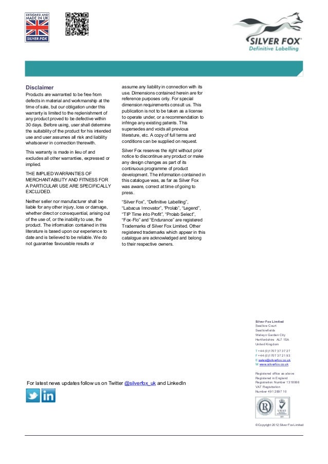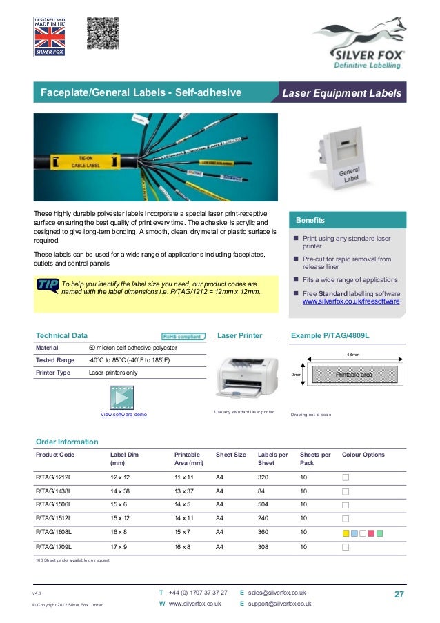 Silver Fox Tie-On Cable Labels - SlideShare features & benefits easy to use and apply pre-perforated for rapid removal from sheet apply to any cable from od ø 10mm - unlimited approvals authorised for use by london underground registration no. 1105 printing method standard laser printer material polyester thickness 175 microns sheet size a4 standard colours white, yellow, blue, red, … P08/2512LW Silverfox, Wire Marker, Laser Printable Wrap ... - Farnell The P08/2512LW is a Prolab® Standard Laser Wrap-around Cable Label made of self-adhesive matt polyester. The Silver Fox Prolab® standard wrap-around cable labels are self-laminating and can be printed using a standard office laser printer. The clear tail on the label wraps around the cable and the printable area giving additional protection to the message printed.