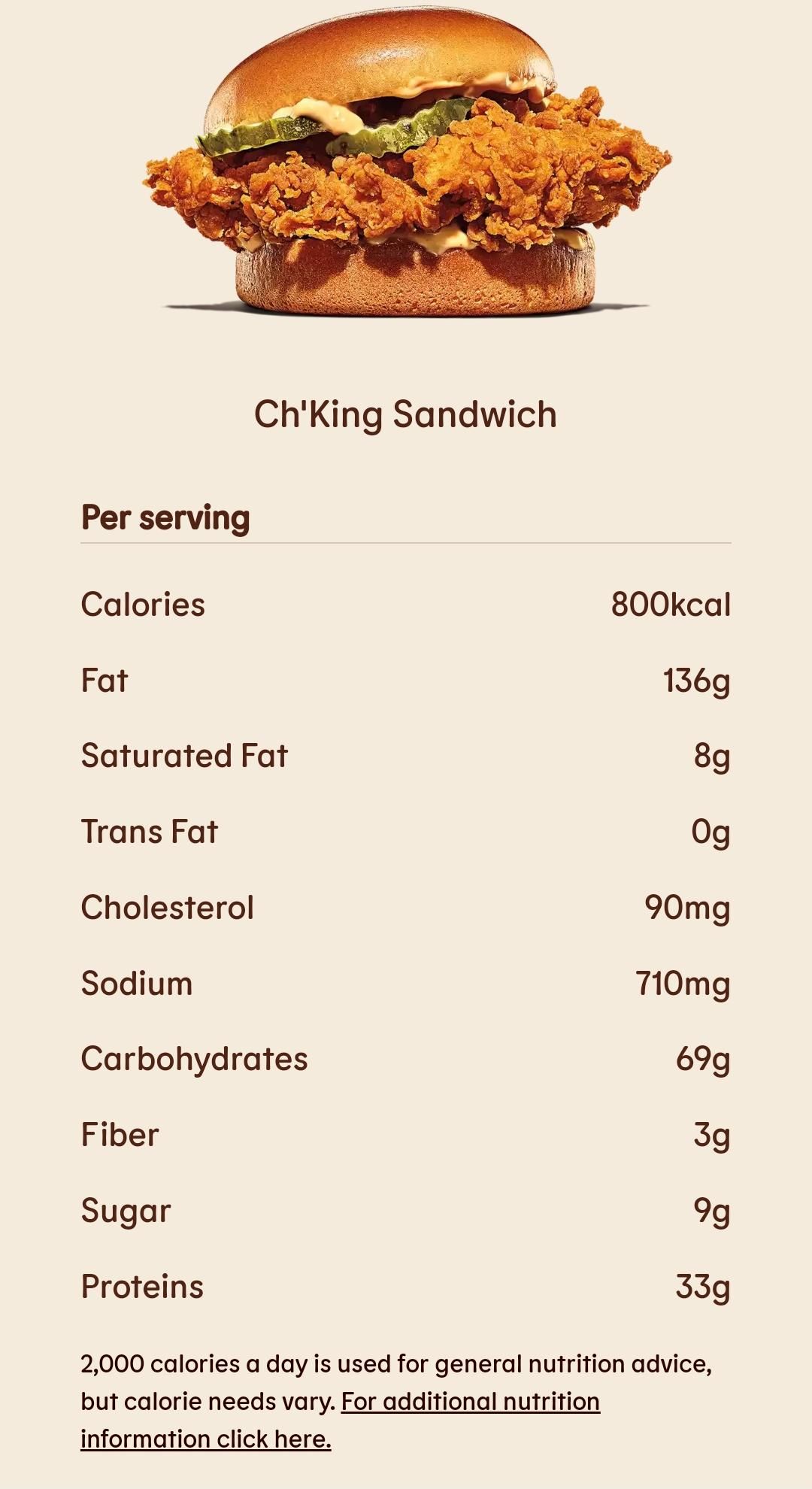 Burger King Calories and Nutrition Facts Burger King Calories and Nutrition Menu. Food Calories Protein Total Fat; American Cheese: 40: 2g: 3.5g: Bacon & Cheese Crispy Chicken Sandwich: 800: 30g: 52g: Bacon King Jr. Sandwich: 570: 29g: 38g: ... Burger King is one of the most popular restaurant chains in the world that is known for its tasty burgers and fries. Its popularity is due to ...